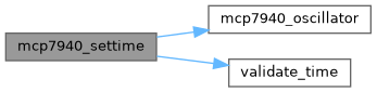 This function first validates the time fields using validate_time(). If validation fails, it returns MCP7940_Error_Fail immediately. Otherwise, it writes the hour, minute, and second values to the MCP7940 RTCHOUR, RTCMIN, and RTCSEC registers using mcp7940_setdata(), then enables the RTC oscillator via mcp7940_oscillator() so that timekeeping starts or continues from the new value. The implementation assumes that conversion to the device’s register format (for example BCD) is handled inside mcp7940_setdata().