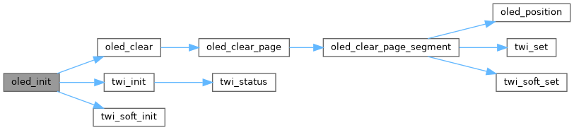 This function initializes the TWI (I2C) communication interface to the OLED display, supports both software and hardware TWI based on compile-time configuration. It then sends a predefined sequence of initialization commands stored either in EEPROM or program memory to configure the OLED hardware registers and settings. After sending the initialization commands, the communication is ended with a stop condition, and the display is cleared to prepare it for use.